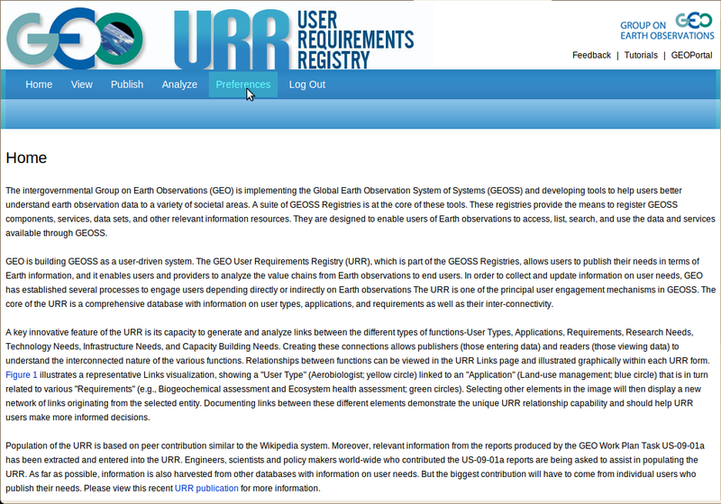 Introduction In the Preference menu, URR users are expected to be able to personalize their URR appearance and function to satisfy their interests and needs. Although the number and type of Preference submenus will have to evolve with experience and user feedback, it is expected that they will include issues such as: Forms, Societal Sectors, SBAs, Subfields, Keywords, Portfolio and Lists. Preference forms might allow users to select a subset of forms to be considered, for example, during an analysis or in a search. The submenu issues Societal Sectors, SBAs, Subfields, and Keywords would allow users to select the subset in each list that will be active during their URR visit. To narrow relevant activities, only entries for users that fall into those subsets will be considered. For example, if a user selected the Water and Disasters SBAs, then only those entities that have Water or Disasters data as a relevant SBA will be considered in any function of the main menu items. The 'Portfolio' submenu would allow a user to narrow the set of entities to be considered in certain menu functions (e.g., in Analyze or View) to specifically selected entries. Once a user has initialized a portfolio, there are expected to be several options to add entries to the portfolio. For a users not logged in under a personal account (i.e., internally handled as an anonymous user), the availability of any selected preference would be limited to the current session. |