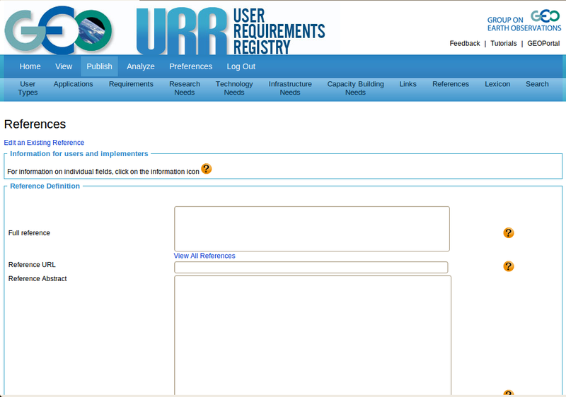 The URR allow association of most entries with reference to publications containing more in-depth information relevant for the entry. For this purpose, the URR integrates a very simple registry for references. The main attributes for an entry in this registry are the full reference according to a straight-forward format used by several scientific journals, a URL to a on-line version of the publication (if available), and an abstract/summary of the reference. Before entering a new reference, it is recommended to first search the list of available entries to avoid duplicated entries. This list can be accessed by clicking on 'View all references'. The list shows all available entries in References. The 'Edit' link allows loading an entry into the form for further edits. |