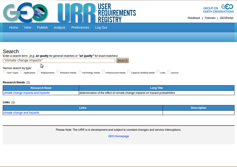Editing an Existing Research Need Entry There are several ways of loading an existing research need entry into the form for further edits. You can access an entry through the list that comes up after clicking on 'Edit/View all'. You can also type the name of the research need into a blank form and then click on Save. Save will check for an existing entry with this name, and it will load this entry if it already exists. In the example, we typed in 'climate change impacts and hazards', which after a click on the 'Save' button, resulted in the form as shown. For research needs, this approach is not practical since research needs often have long names. The same result could have been reached more easily by first bringing up the list of all research needs and then clicking on 'climate change impacts and hazards'. Another way of populating a form with an existing entry is to perform a search with appropriate text string and then selecting the desired entry. In the example, we conducted a search for 'climate change impact', which brought up the list as shown. Since we enclosed the string in quotes, only those entries are listed that contain the exact string. We can now click on the entry name to load the entry for 'climate change impacts and hazards' into the form for further edits. |