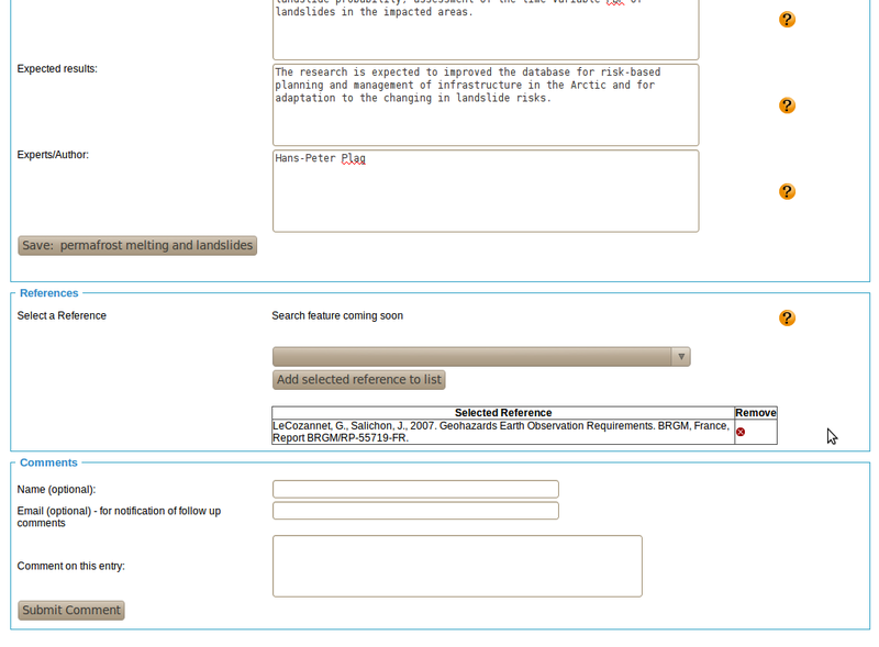 Linking to references Once we have completed and saved the entry, the form fields for references and comments are active. We select one or more relevant references from the list of available references. The number of reference that can be linked to an entry is not limited. References can be removed by clicking on the 'delete' icon. |