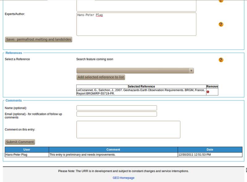 Adding comments In this example, we add a comment on the (new) entry for 'precipitation for global NWP' inviting further discussions and improvements of this entry. Since currently no information about publishers is automatically stored, it is recommended that you add a comment with your name, e-mail address and an information about the status of the entry so that other are informed about the origin. After clicking on 'Submit Comment', the comment is permanently stored and displayed at the end of the form. Comments are displayed in reversed chronological order. |
