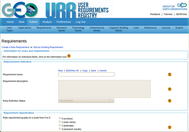 Introduction In the context of the URR, requirements are specifications for observations or products in terms of Earth system quantities, locations, spatial and temporal resolution, latency, accuracy an many other characteristics. Most often, a requirement will be related to one or more applications in the sense that the application depends on the specified information in order to be carried out. Naming requirements requires careful considerations. On the one hand, a very general name (such as 'precipitation') may leads to overlaps with requirements for the same quantity but with different characteristics. On the other hand, a very specific name (e.g., 'precipitation for malaria early warning') may lead to duplications for the same quantity and nearly identical characteristics for other applications (e.g., 'precipitation for meningitis early warning'). The edit functions are described in detail in the Edit tutorials included in the General section for the Publish menue, specifically for the functions New, Edit/View all, Copy, Save, and Cancel. Although Save will carry out a check for uniqueness, it is recommended to check the URR for similar or identical requirement names before entering an anticipated new requirements name into a blank form. You may check the list of existing requirements, which can be accessed through the 'Edit/View all' button for the intended name or similar entries. The list of all published requirements includes the requirement name of each entry, the date of the last update, the number of comments available of the entry, and the date and author of the last comment on the entry. It may also be helpful to conduct a search for a major keyword associated with the anticipated new requirement, which may lead to the discovery of entries that refer to a similar requirements with slightly different name (see the tutorials on searches). |