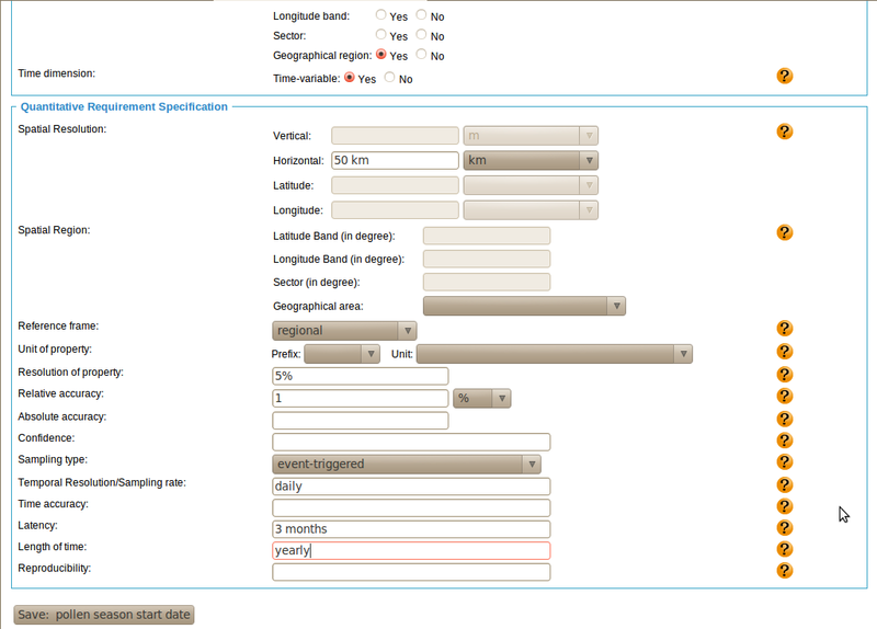 Publishing New Requirements: Quantitative Attributes We now fill in the quantitative requirement attributes. For our example of 'precipitation for global NWP', we specify a horizontal resolution of 100 km, select the unit to be in millimeters, and specify the resolution and accuracy of precipitation observations to the be 0.01 mm. We need time series of precipitation with 3 hours sampling interval and a latency of 1 hour or less. Of course, these time series need to be available continuously. After we have entered all quantitative attributes, we can save the entry to the database by clicking on the 'Save' link on top of the form or the 'Save precipitation for global NWP' button. In case you want to leave a form before finishing the complete entry, it is important to save the partial entry by clicking on the 'Save' button. Otherwise, all entered information is lost. For our example of 'pollen season start date', we require a spatial resolution of 50 km over land areas, ask for a resolution of 5% and accuracy of 1% in pollen activity. The sampling is event-triggered, that is, daily monitoring starts at a realistic time with weather warm enough to trigger the pollen season, and the requested latency is rather relaxed at three months. After we have entered all quantitative attributes, we can save the entry to the database by clicking on the 'Save' link on top of the form or the 'Save precipitation for global NWP' button. In case you want to leave a form before finishing the complete entry, it is important to save the partial entry by clicking on the 'Save' button. Otherwise, all entered information is lost. |