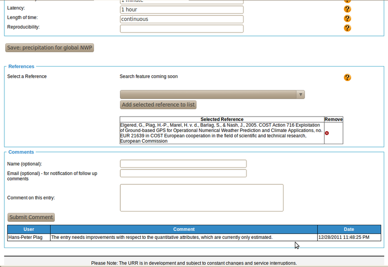 Adding comments In this example, we add a comment on the (new) entry for 'precipitation for global NWP' inviting further discussions and improvements of this entry. Since currently no information about publishers is automatically stored, it is recommended that you add a comment with your name, e-mail address and an information about the status of the entry so that other are informed about the origin. After clicking on 'Submit Comment', the comment is permanently stored and displayed at the end of the form. Comments are displayed in reversed chronological order. |