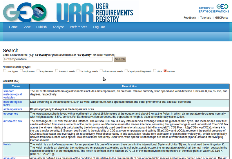 The treatment of strings consisting of several words depends on whether the string is in quotes or not. Entering, for example, the string 'air temperature' without quotes for a search in the lexicon returns all terms that have either 'temperature' or 'air' or both in the name or description. |