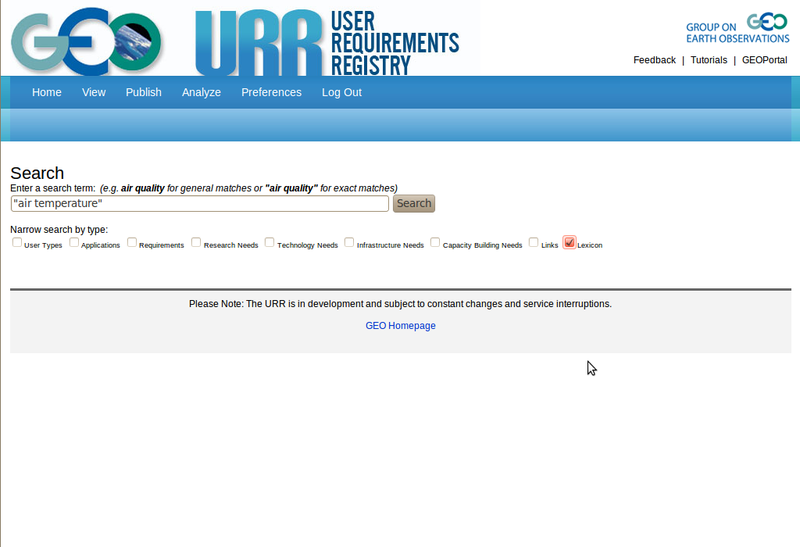 The treatment of strings consisting of several words depends on whether the string is in quotes or not. Entering, for example, the string 'air temperature' without quotes for a search in the lexicon returns all terms that have either 'temperature' or 'air' or both in the name or description. Now, entering, the same string 'air temperature' with quotes for a search in the lexicon |