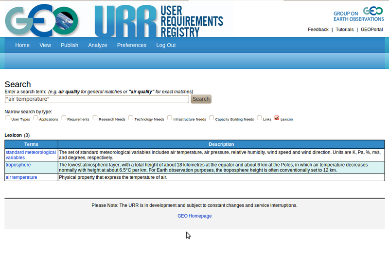 Now, entering, the same string 'air temperature' with quotes for a search in the lexicon