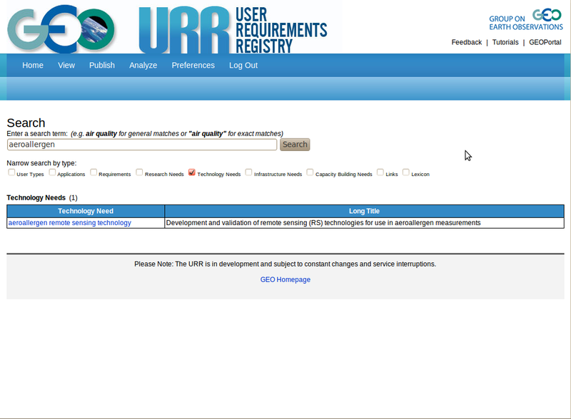 Editing an Existing Technology Need Entry There are several ways of loading an existing technology need entry into the form for further edits. You can access an entry through the list that comes up after clicking on 'Edit/View all'. You can also type the name of the technology need into a blank form and then click on Save. Save will check for an existing entry with this name, and it will load this entry if it already exists. In the example, we typed in 'aeroallergen remote sensing technology', which after a click on the 'Save' button, resulted in the form as shown. For technology needs, this approach is not practical since technology needs often have long names. The same result could have been reached more easily by first bringing up the list of all technology needs and then clicking on 'aeroallergen remote sensing technology'. Another way of populating a form with an existing entry is to perform a search with appropriate text string and then selecting the desired entry. In the example, we conducted a search for 'aeroallergen' and limited the search to Technology Needs, which brought up the list as shown. We can now click on the entry name to load the entry for 'pollen monitoring network' into the form for further edits. |