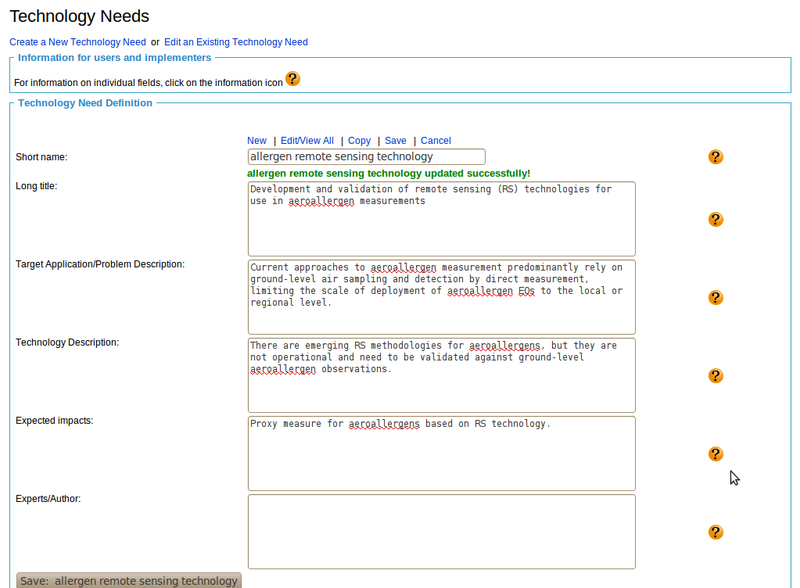 Editing an Existing Technology Need Entry There are several ways of loading an existing technology need entry into the form for further edits. You can access an entry through the list that comes up after clicking on 'Edit/View all'. You can also type the name of the technology need into a blank form and then click on Save. Save will check for an existing entry with this name, and it will load this entry if it already exists. In the example, we typed in 'aeroallergen remote sensing technology', which after a click on the 'Save' button, resulted in the form as shown. For technology needs, this approach is not practical since technology needs often have long names. The same result could have been reached more easily by first bringing up the list of all technology needs and then clicking on 'aeroallergen remote sensing technology'. Another way of populating a form with an existing entry is to perform a search with appropriate text string and then selecting the desired entry. In the example, we conducted a search for 'aeroallergen' and limited the search to Technology Needs, which brought up the list as shown. We can now click on the entry name to load the entry for 'pollen monitoring network' into the form for further edits. The name of an existing entry can be changed. In the example, we have changed 'aeroallergen remote sensing technology' into 'allergen remote sensing technology'. Clicking on Save initiates an uniqueness check. Since no entry with the new name existed, the name change is accepted. |