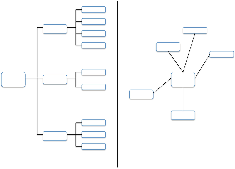 Methods for Populating the URR There are several ways of approaching the analysis of the various needs and requirements that can be published in the URR. In this part of the tutorial, we explain these approaches and show a few examples that emphasize the pros and cons of each method. The approaches separate into two main classes, which we denote as global and local approaches. The first one is more top-down and the second one more bottom up. In an global approach (left sketch), we take a starting point at a high level and rather general entry. This could be an application, user type, requirement, etc. We will use the examples of "integrated coastal zone management" (ICZM) and "risk-based planning" to illustrate this approach. A user type providing a good starting point could be "national government," and an example for a high-level requirement would be "atmospheric methane contents." Starting from the selected entry, we can identify all those activities and needs that related to this entry and then progress for each of them to the next level. In this approach, it makes sense to analyze first the dependencies within one relation, e.g., applications. In a local approach (right sketch), we can take any possible entry as the starting point and analyze the local environment of this entry. As an example for this approach, we will use the application Early Warning. While a local approach lends itself to a more ad hoc start and an immediate publishing, a global approach requires considerable analysis prior to the publication of any entries in the URR. The local approach requires some effort to ensure that the local environment is linked appropriately to the existing contents in the URR and does not duplicate already existing entries. The local approach can be used by any expert in a narrowly defined area of decision making. A global approach requires a broad expert knowledge of a comprehensive field. In the global approach it is also important to use as many of the existing entries and to link the determined structure with the rest of the URR at all appropriate levels. |