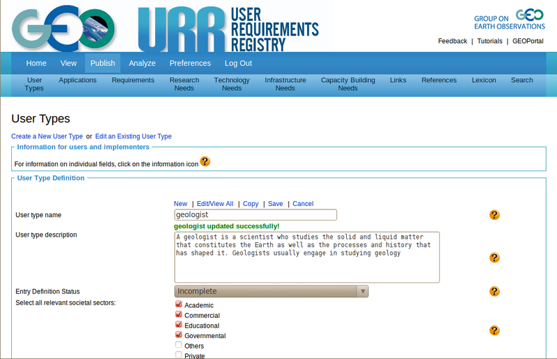 Publishing New User Types: Starting a New Entry Publishing a new user type starts with clicking on the 'New' link and then entering the anticipated new user type name into the respective input field. After that, we click on the 'Save' button. In the example, we have entered the user type name 'seismologist'. After a click on Save, we are informed that the new entry has been successfully added, and the form is now open for editing this entry. |