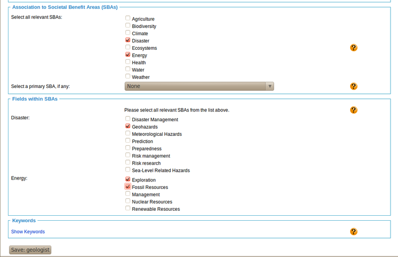 Publishing New User Types: Associating with SBAs The selection of relevant Societal Benefit Areas (SBAs) should also be restricted to those that have a clear relation to the user type. If possible, a primary SBA should be selected. In our example, i.e., for the user type 'seismologist', we only selected one SBA, which then also is the primary SBA. After the selection of SBAs, sub-fields for each selected SBA will be displayed. Since we only selected the SBA 'Disasters', only the fields within the Disaster SBA are displayed. Seismologists are relevant to many of these Fields, and we select all those relevant. Note that the lists of Fields within SBAs are not complete. If you have any suggestions for additional fields in a SBA, please mail this to URR admin. |
