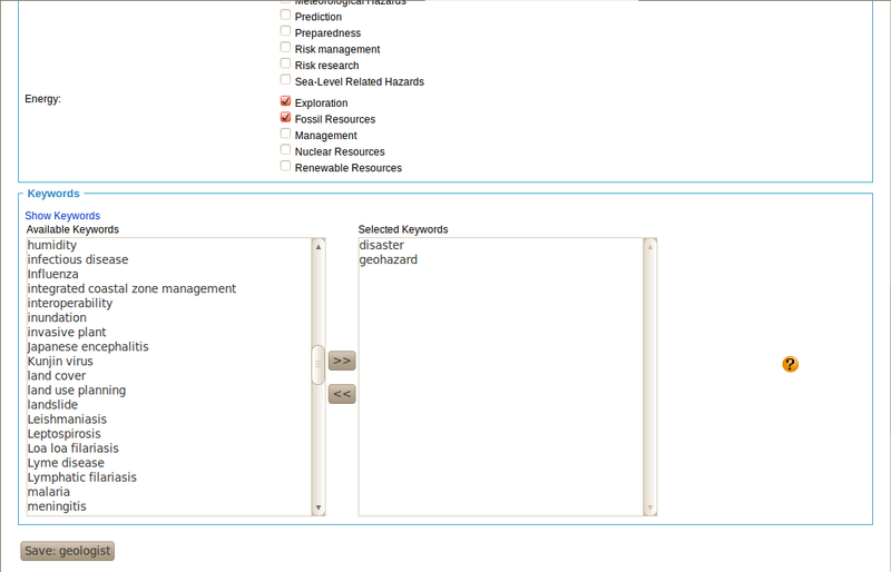 Publishing New User Types: Selecting keywords The next step is the selection of keywords that enable efficient discovery of the user type. When selecting keywords, you should considered what terms a user of the URR might associate with the current user type. The list of available keywords is determined in the Lexicon. If you have a specific keyword in mind, which is not included in the list offered, go to the Lexicon and publish the respective term as a keyword. In our example, we selected the keywords 'disaster' and 'risk management' (not shown). One might argue that 'early warning' is also a reasonable keyword associated with the user type seismologist. Note that the list of keywords is rapidly growing. We are considering to change the presentation of keywords in the near future to better handle the long list. After we have made all desired choice, we can update the entry in the database by clicking on the 'Save' link on top of the form or the 'Save Seismologist' button at the end of the entry form. In case you want to leave a form before finishing the complete entry, it is important to save the partial entry by clicking on the 'Save' button. Otherwise, all entered information is lost. |
