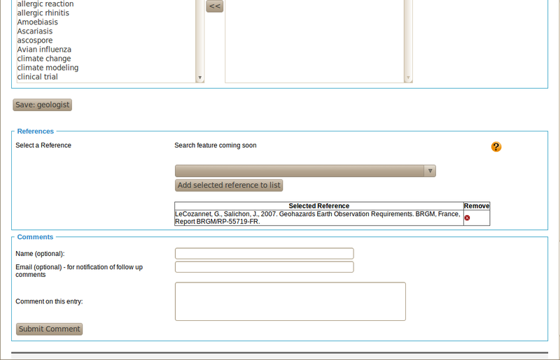 Publishing New User Types: Linking to references Once we have completed and saved the entry, the form fields for references and comments are active. We select one or more relevant references from the list of available references. The number of reference that can be linked to an entry is not limited. References can be removed by clicking on the 'delete' icon. |