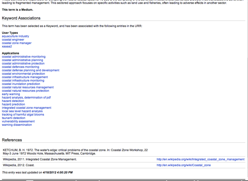 Viewing Lexicon entries Clicking on the Lexicon button in the View menu brings up a list of all entries in table Lexicon. In this list, the first column displays the term defined by the Lexicon entry, and the second column provides the description of the term. The last column indicates when the entry was last modified. On top of the list are select buttons for the controlled vocabularies (see the Semantics tutorial for details on the controlled vocabularies). In the example, we have marked the controlled vocabulary 'Mediums', which leads to the list being updated to show only those terms that are in this controlled vocabulary. Scrolling down the list to 'coastal zone' and clicking on this entry brings up the contents of the entry. The contents of the entry are presented in a easy-to-read rendering. All relevant information is included. If the term is a keyword, then links to all entries in the other relations that are linked to the keyword are provided at the bottom of the display. At the bottom of the display, any references associated with the entry are listed. If a reference comes with a URL, an active link to the reference makes it easy to get access to the additional information in the reference. |