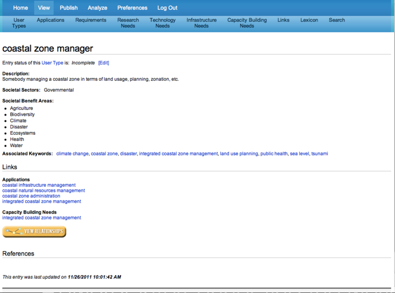 Viewing User Types Clicking on the User Types button in the View menu brings up a list of all entries in table User Types. In this list, the first column displays the name of the User Types entry, and the second column indicates when the entry was last modified. For each entry, the last column has a link to the graphical interface and clicking on this Launch link will bring up a graphics that shows all links for the entry. Scrolling down the list to 'coastal zone manager' and clicking on this entry brings up the contents of the entry. The contents of the entry are presented in a easy-to-read layout. All relevant information is included. Note that each of the entry displays provides after the entry status information a link 'Edit,' which is a shortcut to the respective form in the Publish menu. If you are not logged in, the login screen will come up before the entry is loaded into the respective Publish form. At the end of the display is a 'Relationship' button. Clicking on this button brings up a graphical display of all interconnections for this entry. |