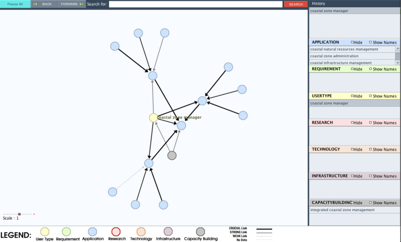 Viewing User Types Clicking on the User Types button in the View menu brings up a list of all entries in table User Types. In this list, the first column displays the name of the User Types entry, and the second column indicates when the entry was last modified. For each entry, the last column has a link to the graphical interface and clicking on this Launch link will bring up a graphics that shows all links for the entry. Scrolling down the list to 'coastal zone manager' and clicking on this entry brings up the contents of the entry. The contents of the entry are presented in a easy-to-read layout. All relevant information is included. Note that each of the entry displays provides after the entry status information a link 'Edit,' which is a shortcut to the respective form in the Publish menu. If you are not logged in, the login screen will come up before the entry is loaded into the respective Publish form. At the end of the display is a 'Relationship' button. Clicking on this button brings up a graphical display of all interconnections for this entry. The graphical interface used differently colored symbols for the individual relations. The thickness of the arrows indicates the strength of the link, while the arrow indicates the direction from source to target. The entry just viewed is shown in the center of the diagram. |