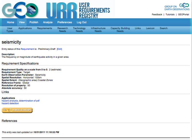 Viewing Requirements Clicking on the Requirements button in the View menu brings up a list of all entries in table Requirements. In this list, the first column displays the name of the Requirements entry, and the second column indicates when the entry was last modified. For each entry, the last column has a link to the graphical interface and clicking on this 'Launch' link will bring up a graphics that shows all links for the entry. Scrolling down the list to 'seismicity' and clicking on this entry brings up the contents of the entry. The contents of the entry are presented in a easy-to-read layout. All relevant information is included. At the end of the entry display is a 'Relationship' button. Clicking on this button brings up a graphical display of all interconnections for this entry. Access to the same diagram is also possible by clicking on the 'Launch' link in the last column of the list. |