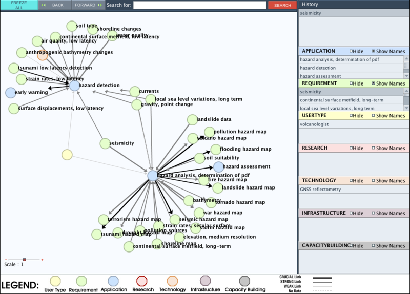 Viewing Requirements Clicking on the Requirements button in the View menu brings up a list of all entries in table Requirements. In this list, the first column displays the name of the Requirements entry, and the second column indicates when the entry was last modified. For each entry, the last column has a link to the graphical interface and clicking on this 'Launch' link will bring up a graphics that shows all links for the entry. Scrolling down the list to 'seismicity' and clicking on this entry brings up the contents of the entry. The contents of the entry are presented in a easy-to-read layout. All relevant information is included. At the end of the entry display is a 'Relationship' button. Clicking on this button brings up a graphical display of all interconnections for this entry. Access to the same diagram is also possible by clicking on the 'Launch' link in the last column of the list. The graphical interface used differently colored symbols for the individual relations. The thickness of the arrows indicates the strength of the link, while the arrow indicates the direction from source to target. The entry just viewed is shown in the center of the diagram. |
