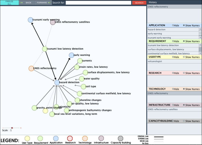 Viewing Technology Needs Clicking on the Technology Needs button in the View menu brings up a list of all entries in table technology Needs. In this list, the first column displays the short name of the Technology Needs entry, and the second column indicates when the entry was last modified. For each entry, the last column has a link to the graphical interface and clicking on this 'Launch' link will bring up a graphics that shows all links for the entry. Scrolling down the list to 'GNSS reflectometry' and clicking on this entry brings up the contents of the entry. Note that the display shows the long name of the entry 'GNSS reflectometry sensor for spaceborne operation.' The contents of the entry are presented in a easy-to-read layout. All relevant information is included. At the end of the entry display is a 'Relationship' button. Clicking on this button brings up a graphical display of all interconnections for this entry. Access to the same diagram is also possible by clicking on the 'Launch' link in the last column of the list. The graphical interface used differently colored symbols for the individual relations. The thickness of the arrows indicates the strength of the link, while the arrow indicates the direction from source to target. The entry just viewed is shown in the center of the diagram. |