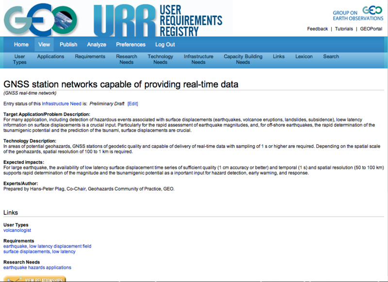 Viewing Infrastructure Needs Clicking on the Infrastructure Needs button in the View menu brings up a list of all entries in table Infrastructure Needs. In this list, the first column displays the short name of the Infrastructure Needs entry, and the second column indicates when the entry was last modified. For each entry, the last column has a link to the graphical interface and clicking on this 'Launch' link will bring up a graphics that shows all links for the entry. Scrolling down the list to 'GNSS reflectometry satellites' and clicking on this entry brings up the contents of the entry. Note that the display shows the long name of the entry 'GNSS reflectometry satellite for tsunami detection.' The contents of the entry are presented in a easy-to-read layout. All relevant information is included. At the end of the entry display is a 'Relationship' button. Clicking on this button brings up a graphical display of all interconnections for this entry. Access to the same diagram is also possible by clicking on the 'Launch' link in the last column of the list. |