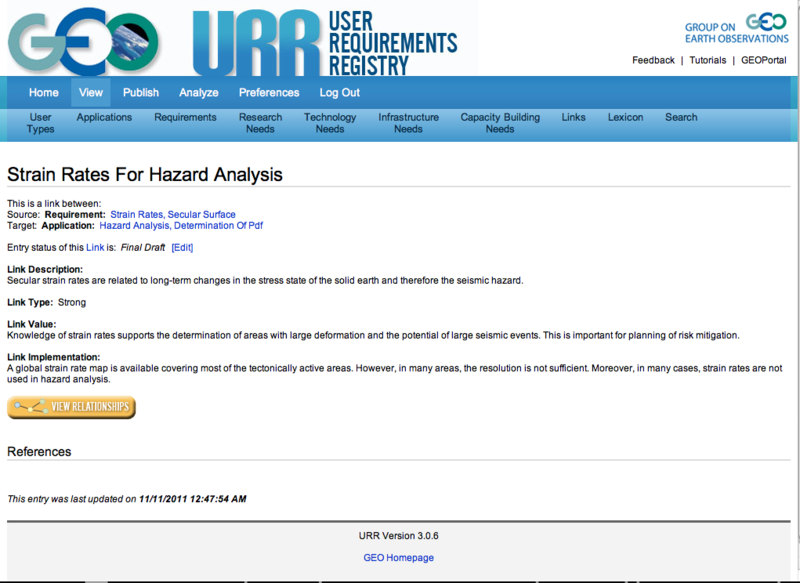 Viewing Links Clicking on the Links button in the View menu brings up a list of all entries in table Links. In this list, the first column displays the name of the Links entry, and the second gives the type and name of the source entry and below that the type and name of the target entry. The third column indicates when the entry was last modified, and the last column includes a 'Launch' button to bring up the grapical tool centered on the source entry of the link. Scrolling down the list to 'strain rates for hazard analysis' and clicking on this entry brings up the contents of the entry. Note that the first letters in each word of the link name have been converted to capital letters. This will be corrected in a future version. The contents of the Links entry are presented in a easy-to-read layout. All relevant information is included. At the end of the entry display is a 'Relationship' button. Clicking on this button brings up a graphical display of all interconnections for this entry. |