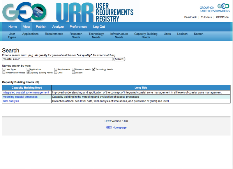 Using Search to view entries Clicking on the Search button in the View menu brings up a screen, which currently allows a simple, string-based search for entries in the seven main relations as well as the Lexicon and Links relations. Typing in the string 'coastal zone' and clicking on the search button brings up a list of all entries that have either the word coastal or the word zone, or both, in their name or description. If the term typed in is a keyword, then also all entries associated with the keyword will be shown. The list shows name and description of each entry. The name of the entry is clickable and can be used to view the contents of an entry. Enclosing the search string in quotation marks and narrowing the search down to only 'Technology Needs' and 'Capacity Building Needs' results in a much reduced list showing only entries that contain the exact search string (not case sensitive, though). In our example, there are only entries in the 'Capacity Building Needs' relation but no entries in the 'Technology Needs' relation matching the search string. |